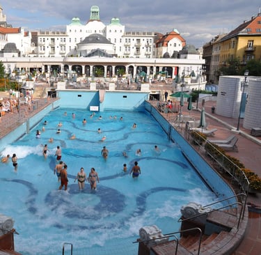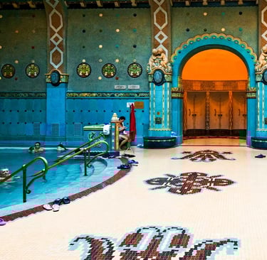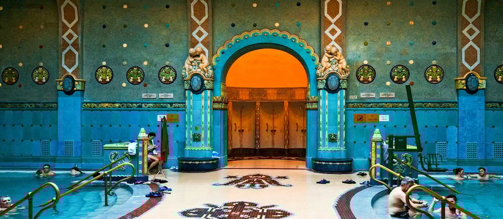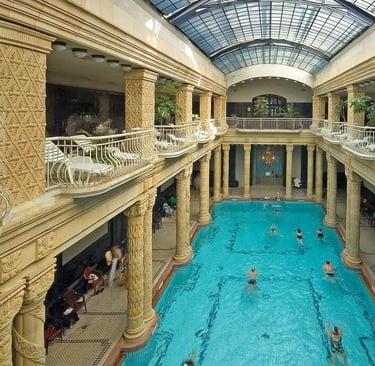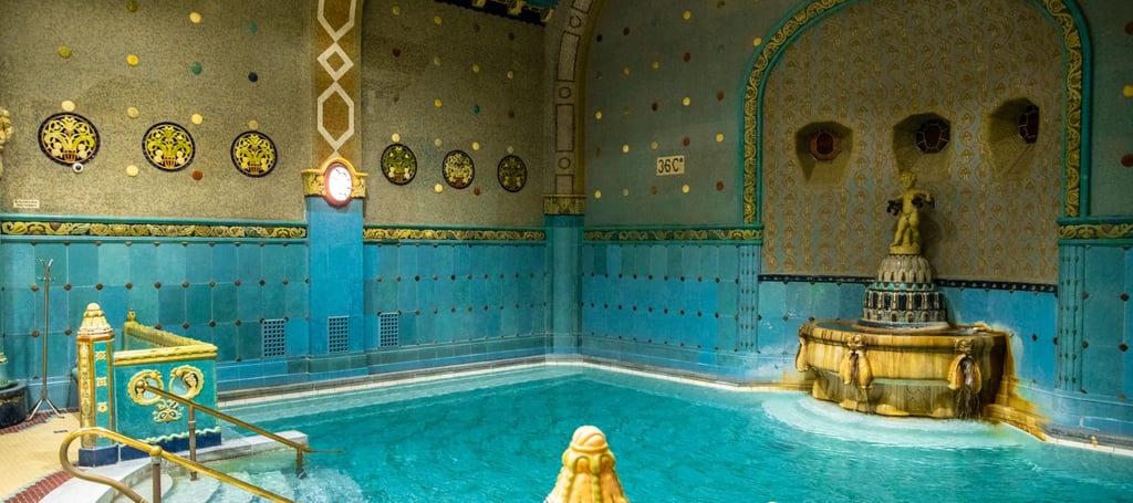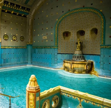 At the heart of the Gellért Bath lies its collection of pools fed by natural thermal springs flowing at over 70°C. These springs provide mineral-rich water containing sulfates, calcium, magnesium and fluoride, which are believed to support treatment for arthritis, circulatory issues, and spinal ailments. The bath offers a layered bathing experience: deep thermal pools maintained at 35–40°C invite prolonged immersion; the adjacent wave pool, open during summertime, offers mild artificial waves in clear water; an indoor swimming pool maintained at about 27°C allows for gentle laps; and plunge pools with varied temperatures enable contrast therapy. Each pool is framed by mosaic-tiled corridors, underwater windows, and sculpted fountains shaped like fish, cherubs or lotus blossoms, turning movement through them into ritual. For many locals and visitors, bathing at Gellért becomes daily choreography—moving between hot pools, cooling plunge basins, steam, sauna and rest areas. Essential to the ritual is a slow pace: restaurative soaking, quiet cooling breaks, and restorative silence in the central rotunda. This sequence of bathing weaves together sensory immersion, historic choreography, therapeutic layering, and cultural continuity.